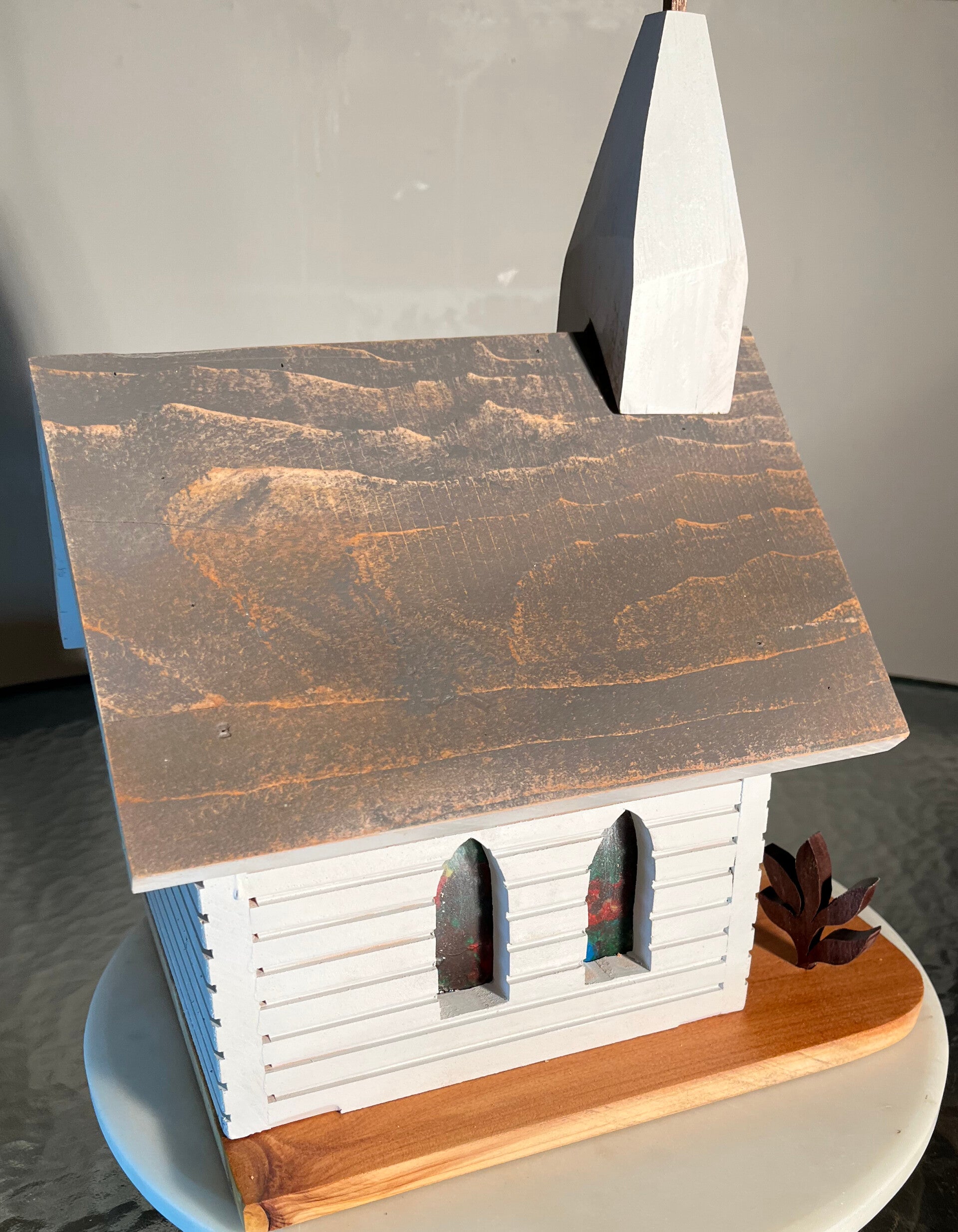 This beautiful church is handmade and crafted by The Would Knot and would look great in any home, This unique home decor item is perfect for women, teens, adults, and kids, adding a touch of charm and style to any space. Made in the United States, this church-themed piece is a versatile addition to any home decor collection. it features hand painted stain glass windows and walnut accents that offers a nice contrast from the white siding. The overall size is 18h x 10w x 12d